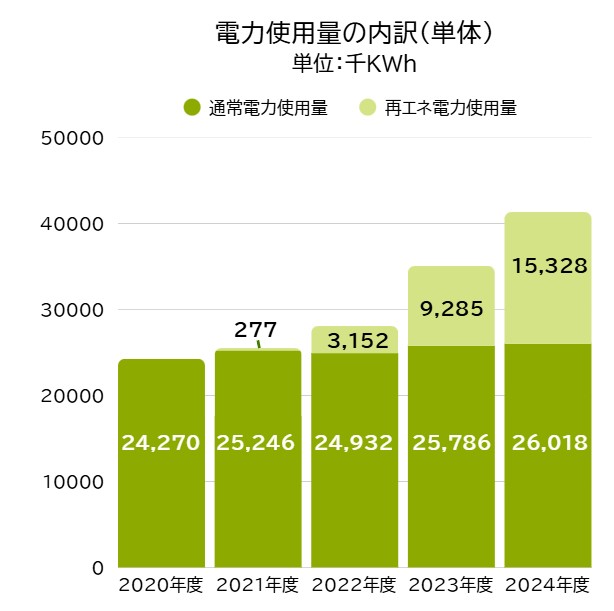 As a "Specified Business Operator" under the Act on the Rational Use of Energy (Energy Conservation Act), we measure the energy used at each of our bases every month and report the results to the Ministry of Economy, Trade and Industry every year. In addition, to improve the efficiency of our energy use, we have set a goal of "reducing the average energy consumption rate by 1% or more per year over a five-year period," and have received an S-class rating, given to companies that achieve this, for 10 consecutive years (emissions results up to fiscal 2024).